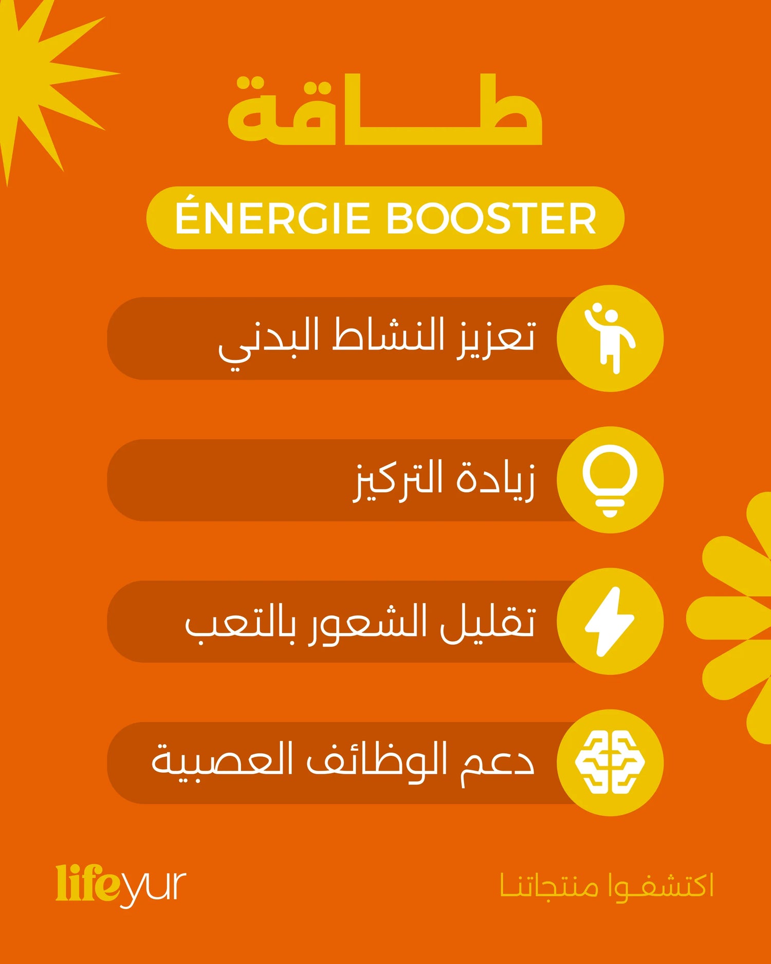 اكتشف Lifeyur Énergie Booster، حليفك اليومي لاستعادة الحيوية، التركيز الذهني و الأداء البدني !
